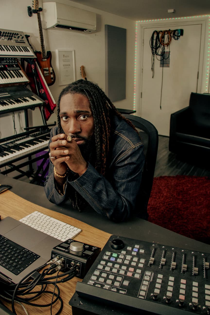 His foundation always starts with authenticity, but he allows himself “to be as open and receptive to whoever’s in the room with me.” Rather than any one personal ritual or tradition, he moulds his creative approach to the artist that he works with – “my process is more, ‘how do I connect with this human being?’” We find that this fluid creative approach also applies to the places he creates in. From London to Paris, LA, Accra, and Lagos, Kwame tells us that “the sound is still the same, but certain decisions I make around it might be different.” Always a traveller never a tourist, he looks to his hosts for “whatever’s either popping, or whatever feels good, I’ll latch on to that, and just add my sauce that way.” This adaptable approach to making music is also expressed in his personal style. Wearing a dark-wash contrast-stitch cowboy tux with oxblood leather boat shoes, Kwame tells us that his wardrobe strives “for uniqueness as much as possible” and would “rather thrift something or get something tailored. Like, with my music everything is bespoke, so my clothes also are a similar thing.” Drawn to comfort and practicality in design, he notes the influence of fashion on the music he makes: